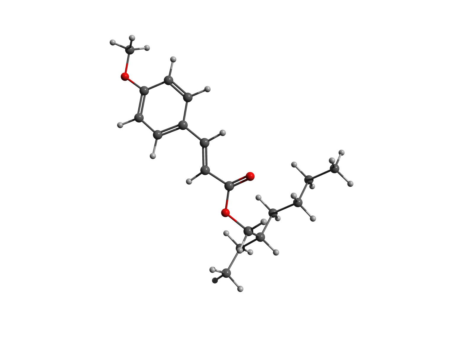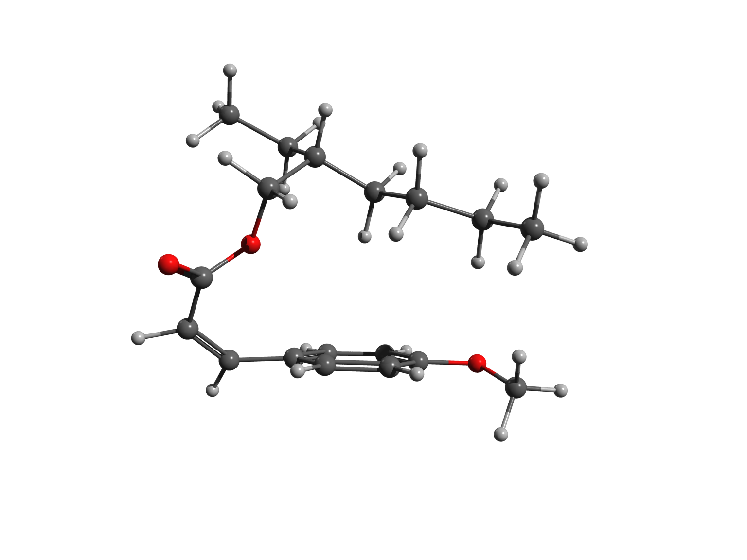 In cis octinoxate, the alkyl chain folds over the other part of the molecule, leading to a more compact shape, stabilized by dispersion interactions. Practically, the chain plays a key role, because it allows the filter to be easily dispersed in the lotions and creams we commonly use to protect our skin.